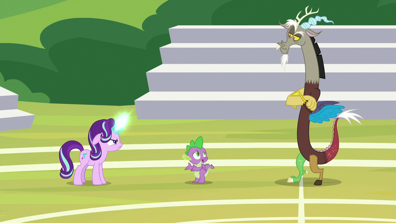 Discord causes a similar disruption by summoning a bugbear to chase the students during P.E. When Yona nearly gets hurt during Discord's lesson, Starlight Glimmer intervenes and angrily scolds him for endangering students and trying to sabotage her headmare duties. However, Discord continues to antagonize Starlight and openly questions her capabilities, and in a fit of frustration, Starlight magically banishes him from the school grounds. Starlight begins to question her own abilities as headmare and wonders why her being in charge upsets Discord so much.