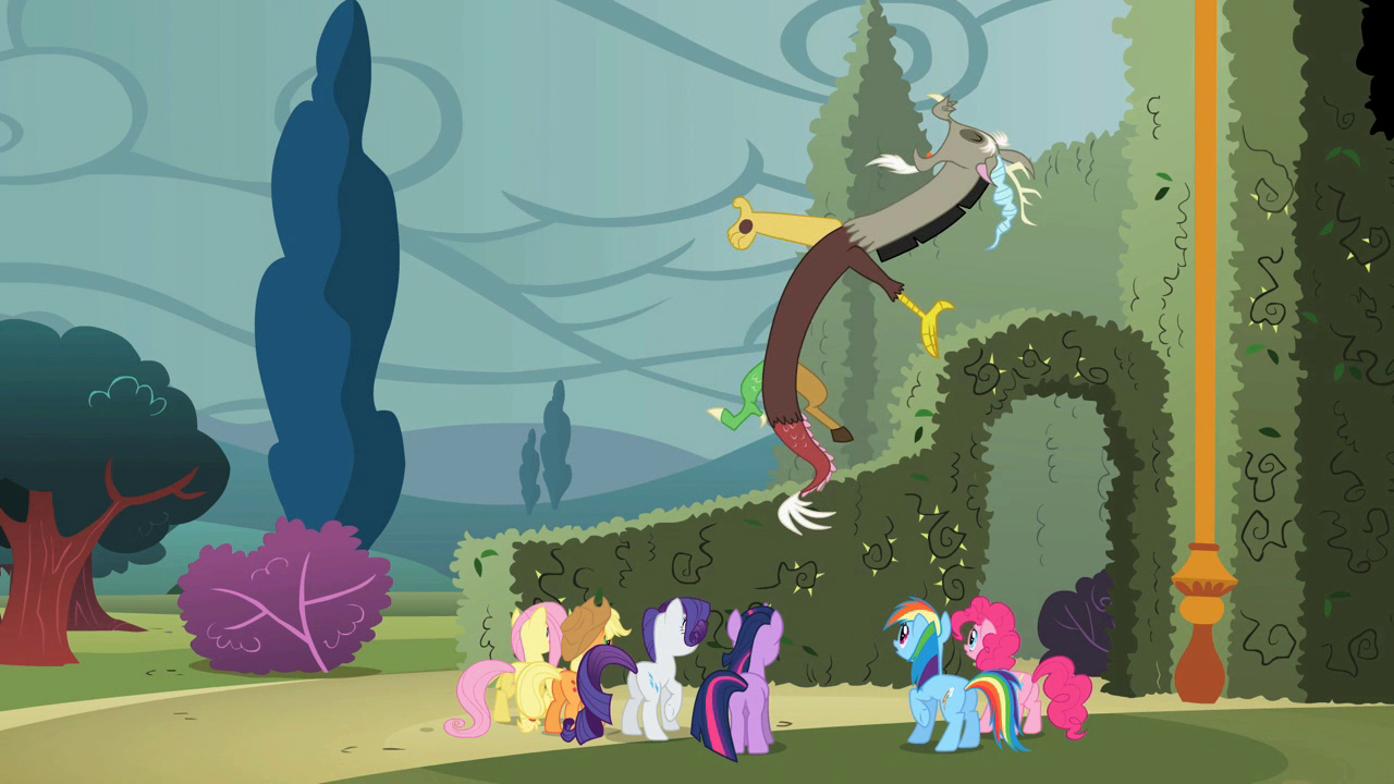 When Twilight and her friends venture into the palace labyrinth, Discord prevents them from "cheating" in his "game" by magically removing the ponies' wings and horns. This enforces the first rule of his game: no flying and no magic. The second rule is that they must all play the game, or else he wins. He separates them in the maze, and the game begins. Discord confronts the Mane Six with trials that make them question themselves, causing them to contradict the elements they represent.