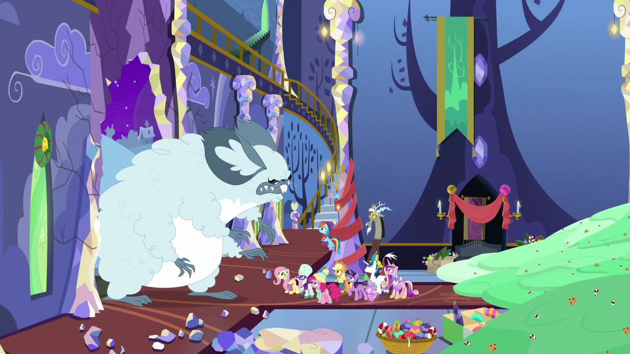 The Mane Six start to come together at the entrance to Twilight's castle, most of them disappointed in themselves for not getting anything special for their Hearthswarming Helper recipients. Just then, Twilight and her family appear running from a tidal wave of pudding, and Rainbow Dash and Discord appear running from the winterzilla. The Mane Six and their friends find themselves trapped between an impassable wall of pudding and a roaring monster.
