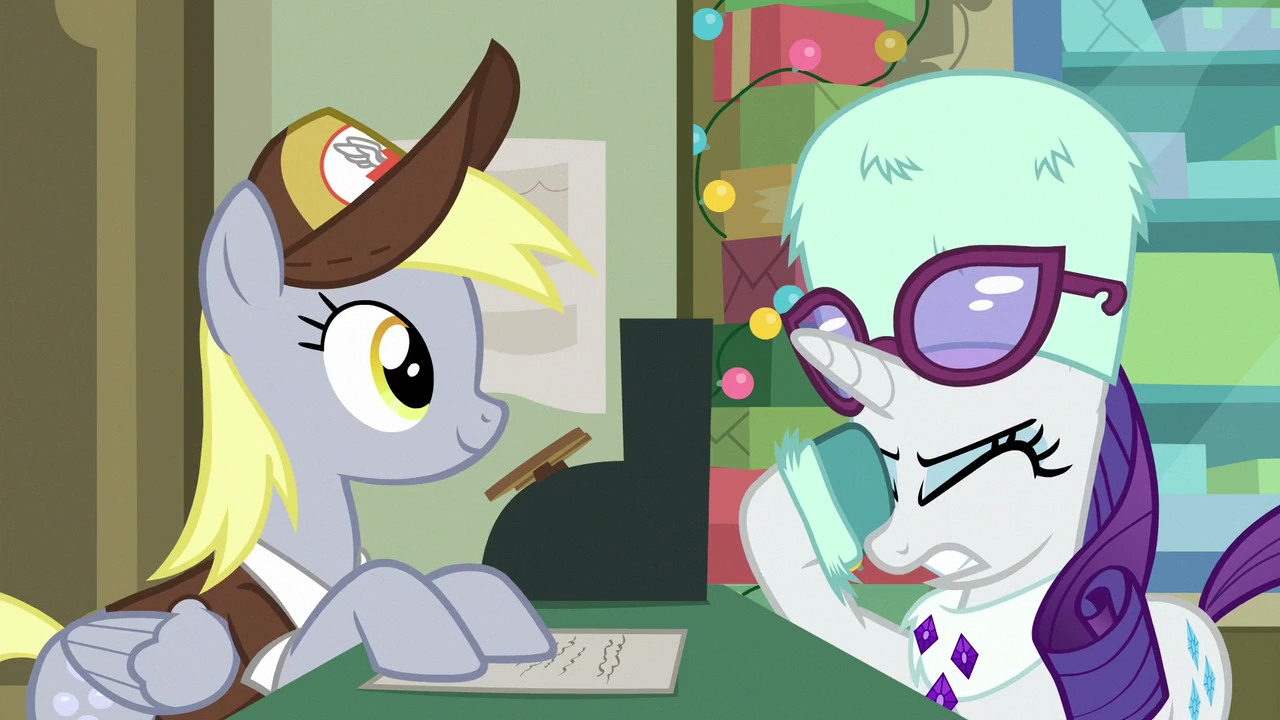 Back in Ponyville, Rarity goes to the post office to pick up her package from Manehattan with Applejack's present. However, due to a mix-up caused by mailpony Derpy, the package was sent to Sweet Acorn Orchard instead of Sweet Apple Acres. To prevent further mishaps, Rarity offers to go to Sweet Acorn Orchard and pick up the package herself. Meanwhile, Rainbow Dash continues searching for a present for Fluttershy, but Discord disapproves of all her ideas. Frustrated, she turns to Discord for suggestions, and he suggests a special animal addition to her Sweet Feather Sanctuary.