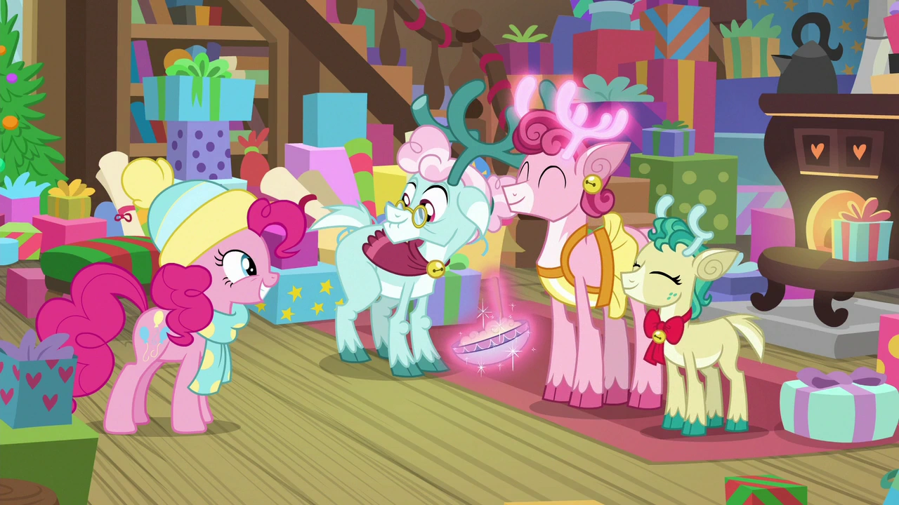 In the arctic north beyond Yakyakistan, Pinkie discovers a small house in a mountain grove, where she meets a trio of reindeer. The apparently prophetic reindeer already know who Pinkie is, have been expecting her arrival, and are even able to predict what she is going to say next. They introduce themselves as Aurora, Bori, and Alice—the Gift Givers of the Grove that Pinkie has been looking for. With a cryptic rhyme, the Gift Givers give Pinkie a present for Twilight. When Pinkie looks inside, she does not understand what the gift means, but the Gift Givers tell her she will understand later.
