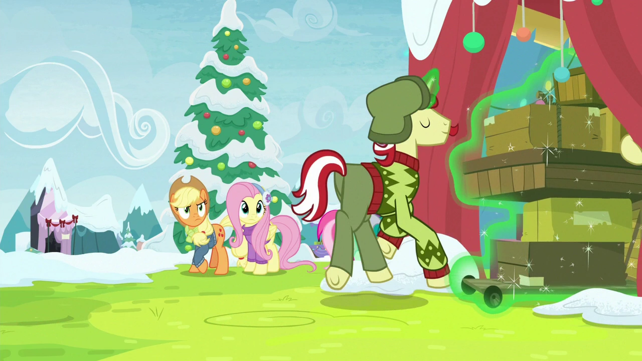 Upset that Flim and Flam are using the holidays for their shifty purposes, Applejack and Fluttershy decide to show their customers a better way. Some time later, they return to Flim and Flam's stand and pretend to be repeat customers. Applejack buys three "Holly the Hearth Warmer" dolls for Apple Bloom, Big McIntosh, and Granny Smith, but Fluttershy points out that giving the same doll to all three of her family members would depreciate the value of gift-giving. This causes the rest of Flim and Flam's customers to question their own purchasing choices, and they walk away, bringing the brothers' latest scam to an end.