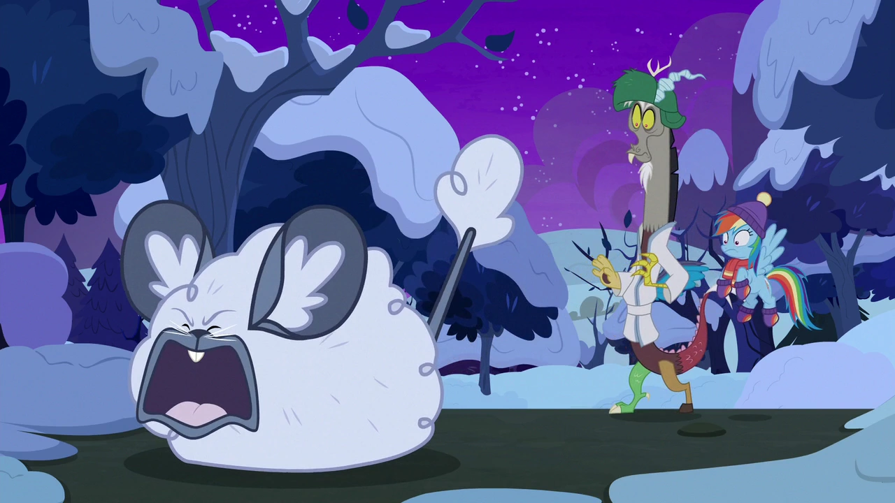 As Rainbow Dash and Discord come out of the forest and approach the castle, Discord bids farewell to Rainbow, having not been invited to spend Hearth's Warming with the Mane Six. Feeling guilty, Rainbow Dash invites Discord to join her and her friends for Hearth's Warming as thanks for helping her find Fluttershy's present, and Discord happily accepts. However, as the sun starts to set, the winterchilla transforms into a giant, monstrous version of itself called a winterzilla.
