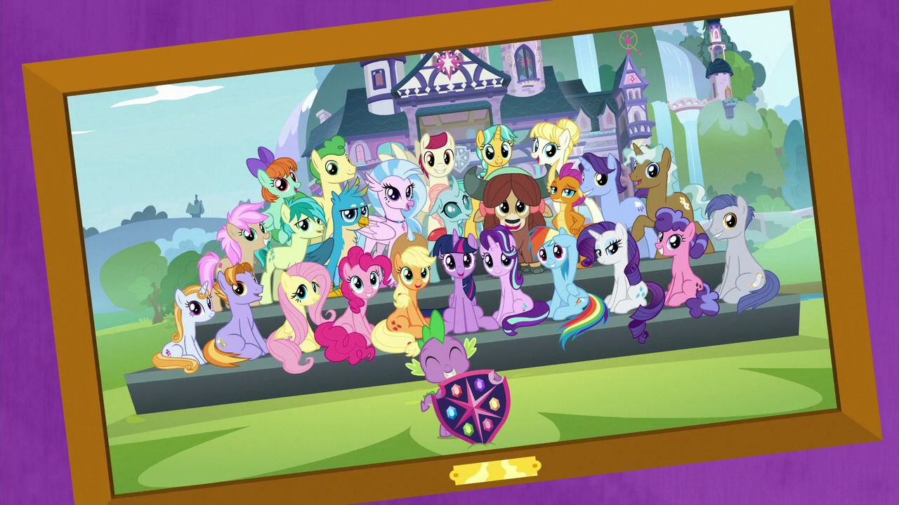 Derpy, White Lightning, Spike, Yona, Silverstream, Ocellus, Gallus, Smolder, seapony Silver Stream, Dr. Hooves, Sprinkle Medley, Sweetie Drops, "Rhythm/Night Shade", Meadow Song, Cloud Kicker, "Mango Juice", another Cloud Kicker, Lemon Hearts, Rainbow Dash, Pinkie Pie, Fluttershy, Twilight Sparkle, Applejack, and Rarity appear at the School of Friendship in Saved by My Friends; Hasbro's YouTube video description refers to the school as Twilight School.[8]