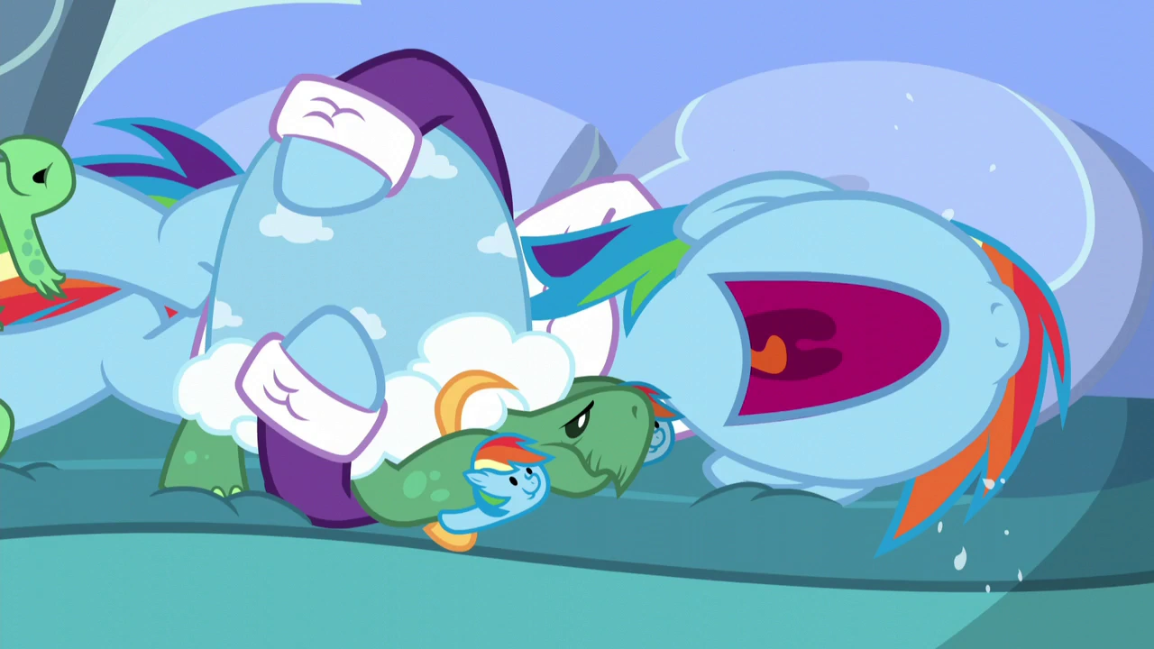 At the Castle of Friendship, Rainbow gets a second opinion from Spike, who insists that tortoises and dragons aren't in the same animal family. Rainbow dismisses Spike's opinion as well and takes Tank out to the cloud fields, hoping that hard work will keep him awake. As her friends take notice of Tank's behavior, the increasingly stubborn Rainbow begins to lash out at them in anger, and she storms off.