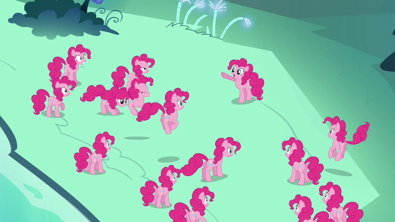 Pinkie and the clone return to the Mirror Pool to duplicate themselves into four Pinkie Pies, but when the real Pinkie makes to leave, the clones perform several more duplications on their own. Brushing past her frustration about it, Pinkie rallies the group and leads them to Ponyville, where she lets them loose after quizzing them on her friends' names.
