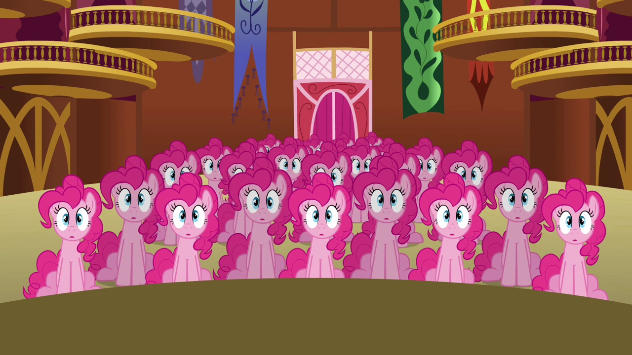 Twilight informs Rainbow Dash, Fluttershy, and Rarity of the plan and leads them to the town hall. Applejack rounds up most of the Pinkies and funnels them inside, soon followed by Rainbow Dash carrying in a single sad-looking Pinkie. Unveiling a wall drenched in wet paint, Twilight announces that the gathering will be watching it dry, and that the one who passes the "test" gets to remain. As they stare at the wall, Pinkies begin getting distracted one by one, whereupon Twilight casts a spell that whisks them back into the Mirror Pool.