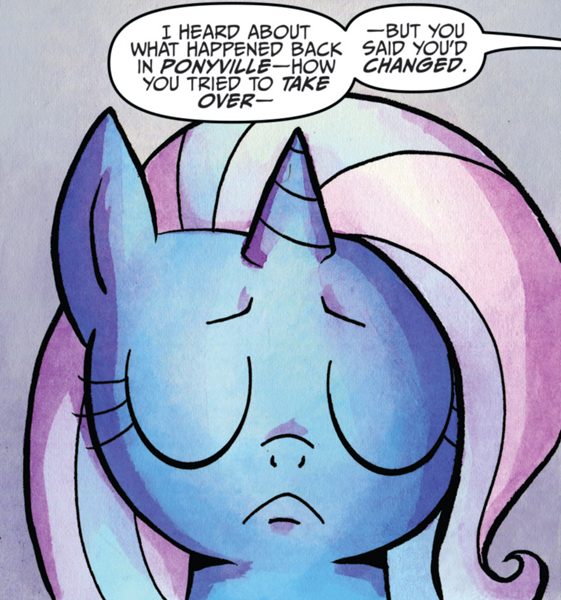 In Issue #101, Trixie is briefly seen helping Starlight lead the School of Friendship students to a safe place before the Knights of Harmony attack Canterlot. In Issue #102, she aids in the fight against the Knights of Harmony, making an illusion of Discord (against whom the Knights bear a long-standing grudge) to draw their attention away.
