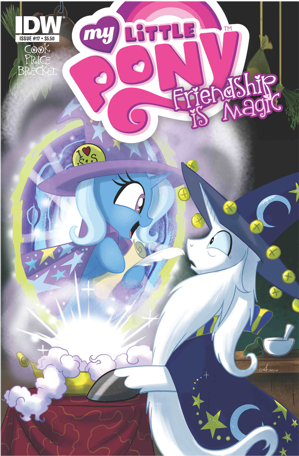 Trixie appears on the Hot Topic cover of Friendship is Magic Issue #5, on cover A and pages 10–11 and 14-15 of Issue #8, on pages 8–9 of Issue #9, on a sketch card bundled with one of the deluxe hardcover releases of The Return of Queen Chrysalis[10] and shown in page 15 of My Little Pony Art Gallery, and on the Hot Topic cover of Issue #12. An alternate universe version of Trixie is shown as an Alicorn in a stained glass window labeled "Humility" on page 12 of Issue #18. Trixie also appears on cover A, cover B, and the Hot Topic cover of Issue #21, and on cover A and cover B of Issue #22. In the story of the two aforementioned issues, Trixie is accused of stealing a priceless diamond in Manehattan and cooperates with Applejack, Fluttershy, Rarity, Apple Bloom, and Babs Seed in clearing her name. Trixie also appears in Issue #23 under the control of kelpie magic and on the Hot Topic cover of Issue #37. In Issue #40, Trixie appears as a filly in a flashback on pages 4, 9, and 12. Of Issue #44, Trixie appears on the Fried Pie Comics cover. In Issue #70, Trixie appears on page 16. On Issue #71 page 2, she appears celebrating Nightmare Night with Starlight Glimmer and Sunset Shimmer. On Issue #73 pages 8-9, she appears discussing Fluttershy's behavior with Twilight, Applejack, and Pinkie Pie. In Issue #75, Trixie is mentioned on page 16. In Issue #84, Ocellus briefly takes on Trixie's appearance as part of her school project. Trixie also appears on Issue #88 cover A.