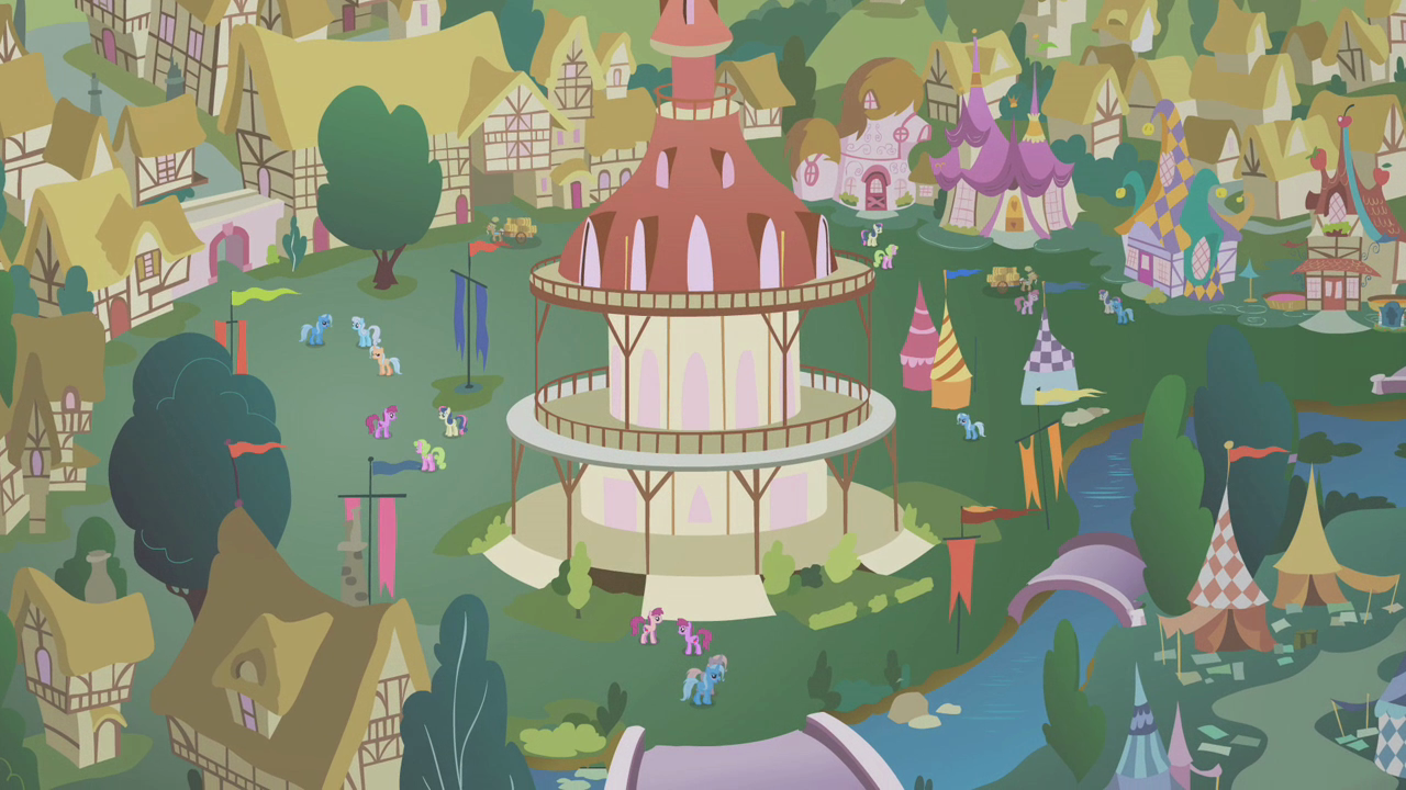 Multiple Trixies can be seen in the background shot of Ponyville's town square in Bridle Gossip, along with two ponies with the same design but different color schemes.
