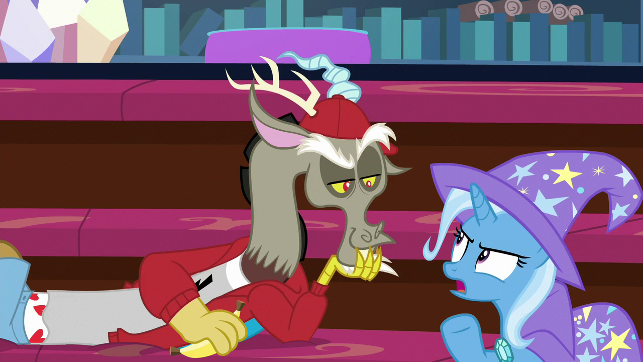 While inside the changeling castle, Trixie frequently teases and argues with Discord. She later serves as a distraction for Starlight Glimmer and Thorax to find and destroy Chrysalis' throne. After Chrysalis is defeated, Trixie joins the ponies of Starlight's old village to celebrate the Sunset Festival and engages in further back-and-forth with Discord.