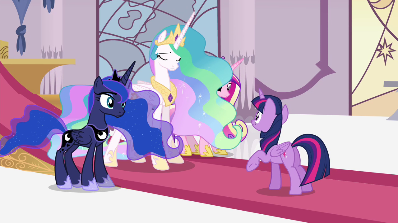 Twilight Sparkle and her friends are back at the Crystal Empire to welcome the duke and duchess of Maretonia. Twilight is delighted that her friends are accompanying her, but she admits her duties amount to just a "smile and wave". When Pinkie Pie asks what's the matter, Twilight says she feels her role as a princess doesn't amount to much. The feeling is only made worse when, during the dignitaries' welcoming ceremony, all Twilight does is unveil a royal banner.